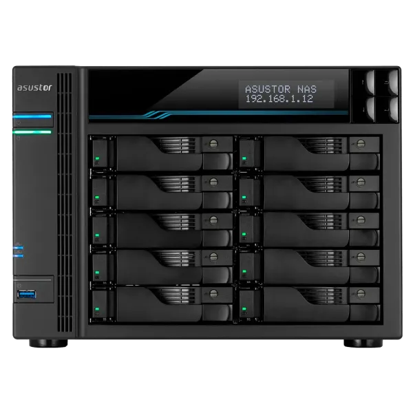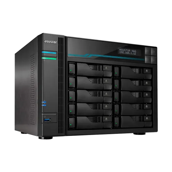 The Asustor Lockerstor 10 AS6510T NAS Storage is a high‑performance data solution designed for businesses needing powerful storage. It features an Intel Atom C3538 quad‑core 2.1GHz 64‑bit processor for reliable multitasking and fast data handling. The Asustor AS6510T NAS Storage comes with 8GB DDR4 SO‑DIMM memory in a 1x8GB module, supports dual memory slots, and is expandable up to 64GB for heavy workloads. The AS6510T NAS includes 4GB eMMC flash memory and offers ten SATA3 6Gb/s bays supporting 3.5‑inch and 2.5‑inch HDDs or SSDs. It delivers a maximum internal raw capacity of 240TB using ten 24TB drives, with capacity depending on RAID type. Storage expansion is simple with support for 18 total bays through expansion units, enabling up to 432TB raw capacity. For improved performance, it features two M.2 PCIe NVMe slots for SSD caching. Connectivity includes two USB 3.2 Gen 1 ports for external devices and four high‑speed network interfaces. These consist of dual 10‑Gigabit Ethernet ports and dual 2.5‑Gigabit Ethernet ports for fast data transfers and smooth multi‑user access. It provides HDMI 2.0a output for 4K media display and system monitoring. The Asustor AS6510T NAS Storage runs on a 250W power supply and supports 100V to 240V AC input for global compatibility. The Asustor Lockerstor 10 AS6510T is certified by FCC, CE, VCCI, BSMI, and C‑TICK to ensure safe and reliable operation across different environments. This NAS system offers exceptional scalability, fast networking, strong hardware performance, and flexible storage options for businesses, studios, and advanced home users seeking secure and expandable data management.